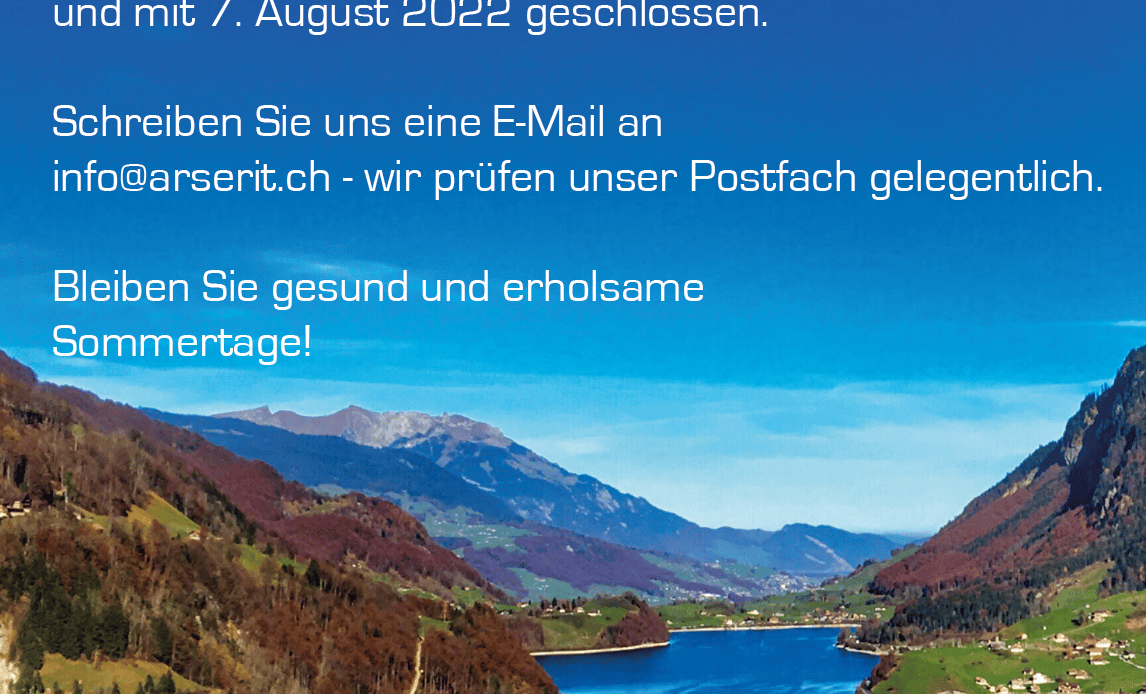 14. August 2022Das ARSERIT Team wünscht Ihnen und Ihrer Familie erholsame Sommertage! Geniessen Sie den Sommer im Kreise Ihrer Familie und bleiben SIE GESUND!